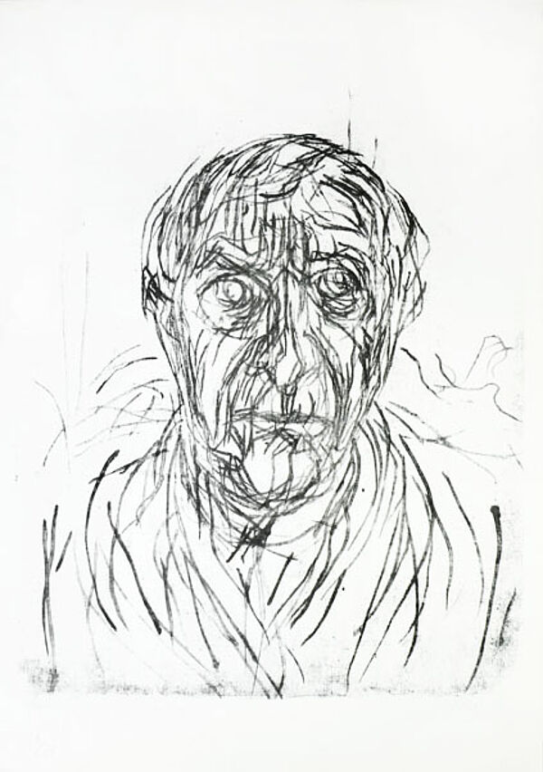 Lithographie auf Bütten, rechts unterhalb der Darstellung mit Bleistift handsigniert, linksseitig betitelt "Hans Jüchser 75 Jahre", auflagenbezeichnet "59/70", Blattmaße ca. 58 x 42 cm, Bildmaße ca. 48 x 38 cm, geringe Alters-, Griff- Lagerspuren, so eine leichte Stauchung der linken unteren Ecke.