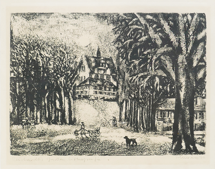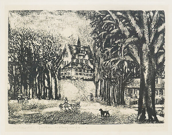 Lithographie auf leicht chamoistonigem Bütten. Dargestellt ist der Blick aus Reichardts Garten (in Halle) auf das Thomas-Münzer-Gymnasium. Rechts unter der Darstellung mit Bleistift handsigniert und datiert (19)"66", links unten betitelt "Reichardts Garten" und bezeichnet "Lithografie", Blattmaße ca. 42 x 59,5 cm, Bildmaße ca. 32,5 x 44,5 cm, leichte Alters-, Griff- und Lagerspuren, insbesondere zeigen sich sich 6 winzige Einrisse an der oberen Papierkante, geringe Bräunung im alten Passepartout-Ausschnitt.