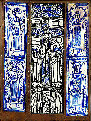 Expressives, wie ein Altar angelegtes Bild aus bemalten Emailleplatten