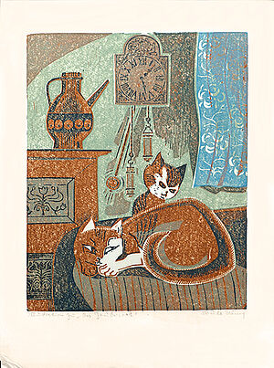 Farblinolschnitt: Illustration zu "Das Zauberwort" (Interieur mit Katzen)