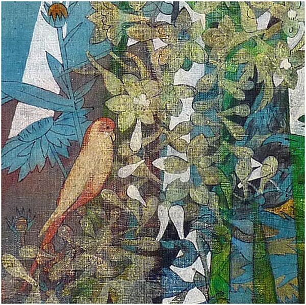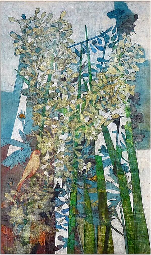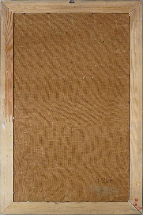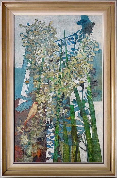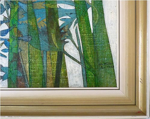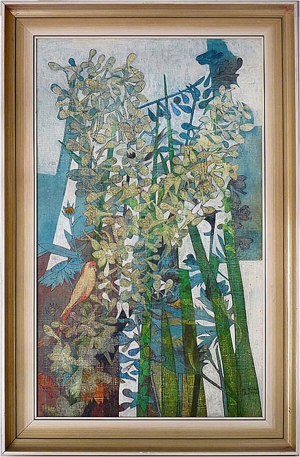 Mischtechnik auf Malplatte, rechts unten signiert und datiert "Juli 1970". Bildausschnitt ca. 71,5 x 42,5 cm, Maße der wohl ursprünglichen, gekehlten Holzleiste in Braun- und Beigetönen (mit moderaten Alterungsspuren): ca. 83 x 54 cm, Rahmenbreite ca. 6 cm.