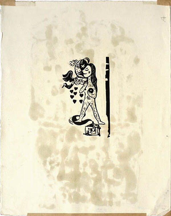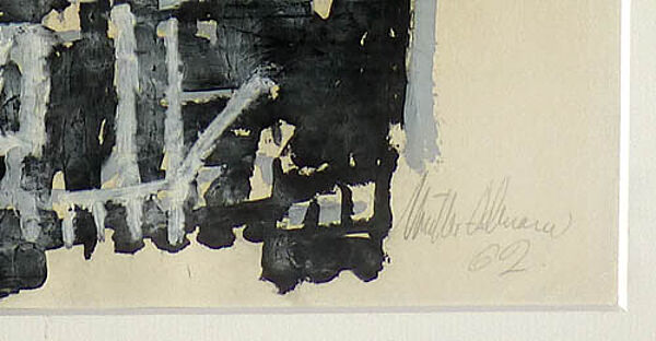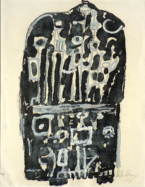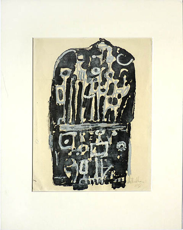 Mischtechnik auf kräftigem, chamoisefarbenem Papier. Rechts unten mit Bleistift handsigniert und datiert (19)62, mit Passepartout. Blattmaße ca. 32,3 x 25,5 cm, Passepartout-Ausschnitt ca. 31,7 x 24,8 cm, rückseitig mit kleiner Druchgraphik. Moderate Alters- und Griffspuren. Typische Arbeit des Informel.