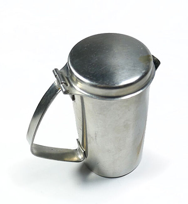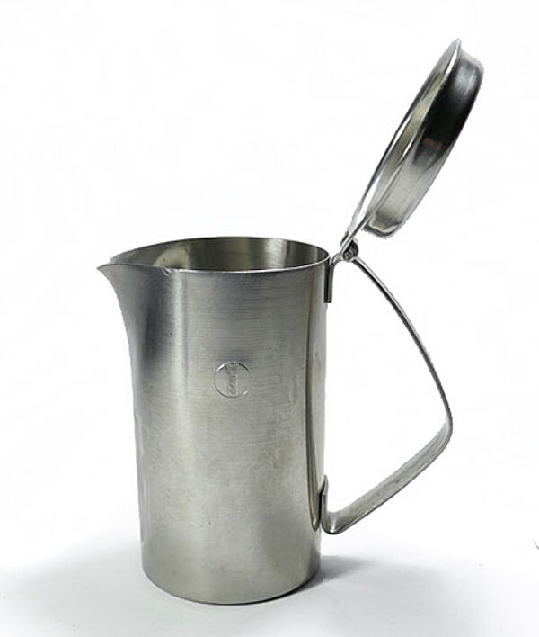 Zylindrischer Korpus aus Chromnickelstahl, flacher Deckel mit Scharnier, dreieckige Handhabe. Unterseitig Markung: "ABS ROSTFREI 188 DDR 20 cl". Höhe ca. 11 cm, geringe Altersspuren. Entwurf von 1959 - 1961, Ausführung wohl bis Ende der 1980er Jahre.