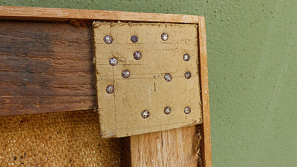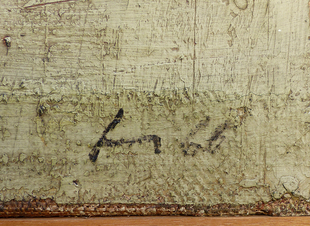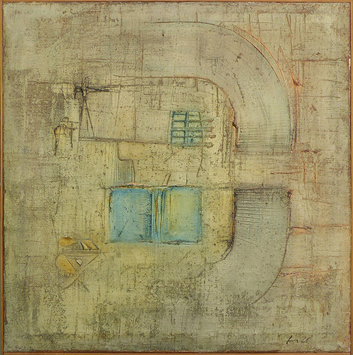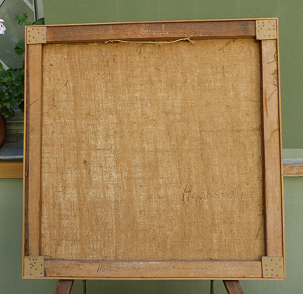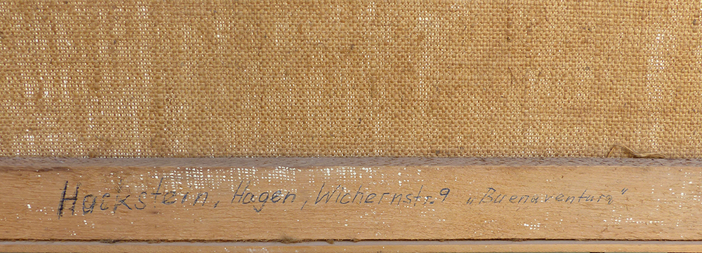 Öl auf Rupfen, rechts unten monogrammiert "H" und datiert (19)"66", rückseitig signiert oder bezeichnet "Hackstein",rückseutug am Rahmen Adressbezeichnung "Hackstein, Hagen, Wichernstr. 9" und Betitelung "Buenaventura". Maße ca. 80,5 x 79cm, am Rand partiell leichter Farbverlust, insgesamt geringe Altersspuren. Schlichte, anliegende Atelierrahmung aus flacher Naturholzleiste.