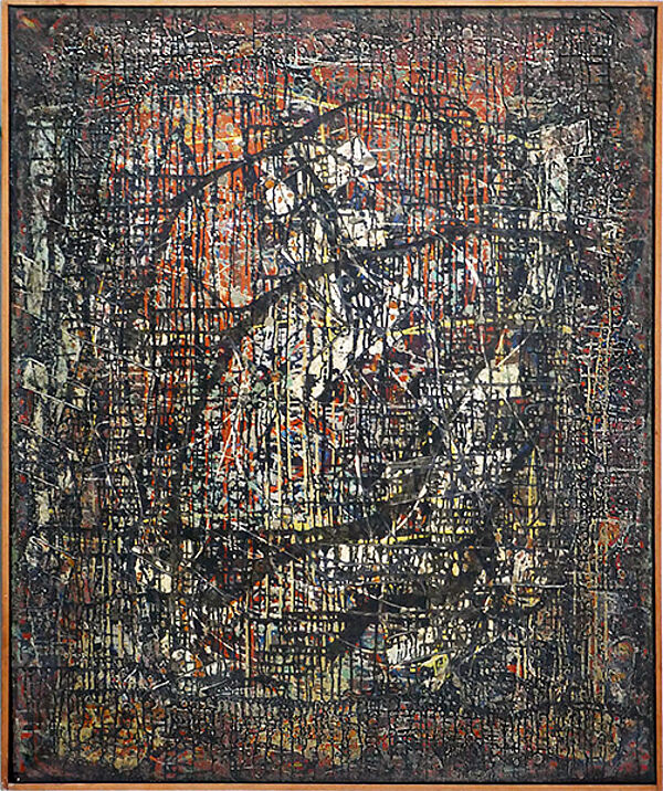 Öl auf Leinwand (tachistische Malerei in Spritz- und Spachteltechnik), rückseitig signiert und ortsbezeichnet "Altötting" und von fremder Hand (?) nummeriert oder datiert "59". Schlichte, vermutlich originale Schattenfugenrahmung aus schmaler Holzleiste. Bildmaße ca. 120 x 100 cm, Rahmenaußenmaße ca. 123 x 103 cm, geringe Alters- und Verschmutzungsspuren. Wohl Ende der 1950er, Anfang der 1960er Jahre.