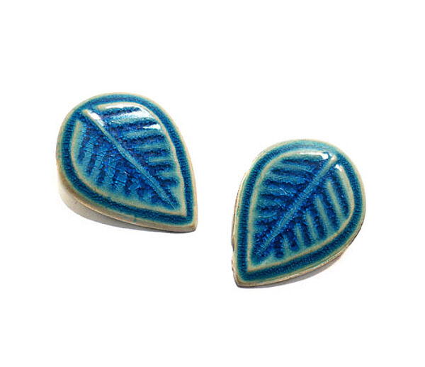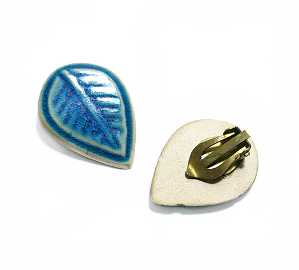 Jeweils tropfenförmiger orpus aus hellem Scherben, oberseitig Ritzdekor in Form eines stilisierten Blattes, türkis und blau glasiert. Maße ca. 3 x 2,2 cm, an einem Ohrring rückseitig ein Flohbiss, sonst geringe Altersspuren. Rückseitig Messing-Clips. Wohl Dänemark der 1970er, 80er Jahre.