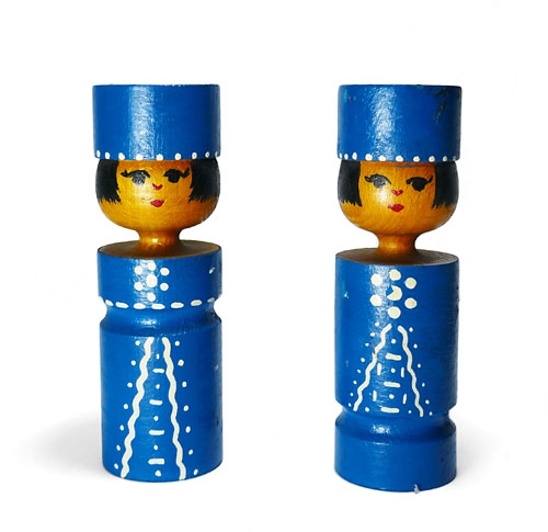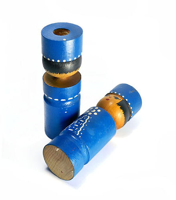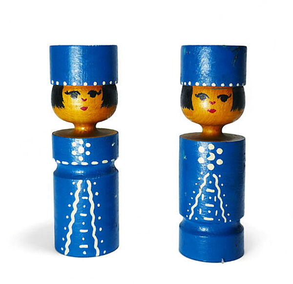 Jeweils zylindrischer, gedrechselter, farbig gefasster Holzkorpus, der eine stilisierte Frau darstellt, vermutlich eine Stewardess (oder eine Frau im ungewöhnlichen Trachtenlook??). Höhe jeweils ca. 10,5 cm, Durchmesser ca. 3,3 cm, geringe Altersspuren. Wohl Erzgebirge der 1960er, 70er Jahre.