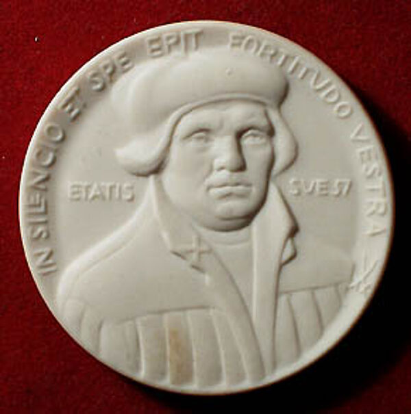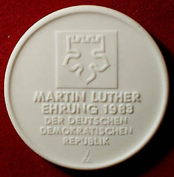 VS: im Feld Dreiviertelporträt Luthers im Talar und mit Barett; entlang des Randes bezeichnet "IN SILENCIO ET SPE ERIT FORTITUDO VESTRA" sowie im Feld "ETATIS SUE 57", ebenfalls im Randbereich Signet der Porzellanmanufaktur. (Die Inschrift der Vorderseite zitiert den Wahlspruch Martin Luthers. Er stammt aus Jesaja 30,15. Luthers eigene Übersetzung lautet: "Durch stille sein und hoffen würdet ir starck sein."; Quelle: www.kenom.de/id/record_DE-MUS-805518_kenom_154918 08/16). RS: Signet der Lutherehrung 1983 und Bezeichnung im Feld "MARTIN LUTHER / EHRUNG 1983 / DER DEUTSCHEN / DEMOKRATISCHEN / REPUBLIK". Durchmesser 4,1 cm, leichte Verfärbung vorderseitig, siehe Foto. Die Vorderseite greift den bereits aus dem Jahre 1967 stammenden Entwurf einer Meißner Porzellanmedaille wieder auf (Graveur Herbert Schellbach).