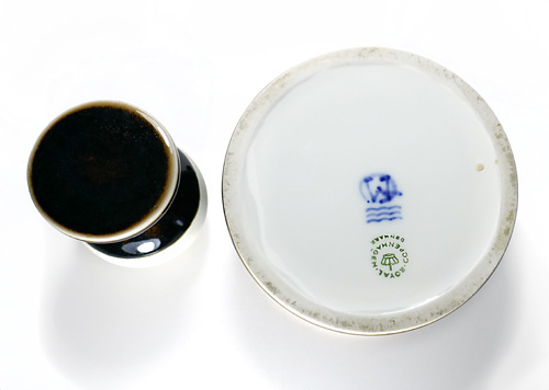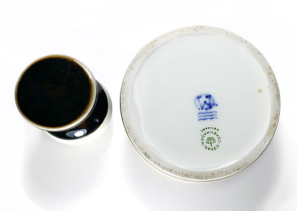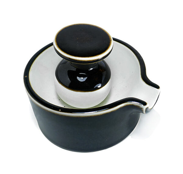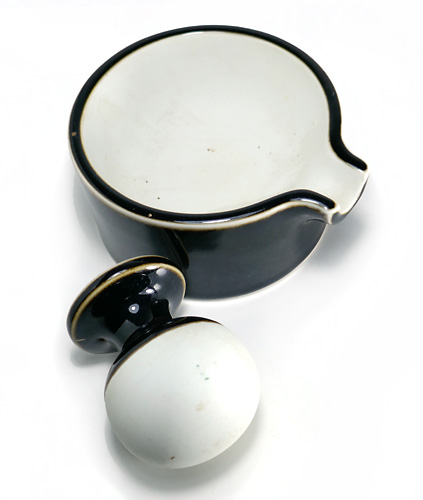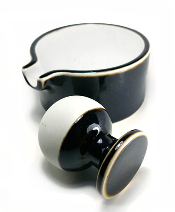 Jeweils Porzellankorpus: das Unterteil ist außen zylindrisch, oberseitig schalenartig gemuldet, an einer Seite rinnenartiger Ausguss. Das Pistill hat eine scheibenartige Handhabe und einen fast kugelförmigen Kopf. Die Reibeflächen sind jeweils unglasiert und somit in der Farbe des Scherbens weiß, der Rest ist dunkelbraun glasiert. Höhe ca. 5,3 cm, Durchmesser ca. 10,5 cm, geringe Altersspuren. Unterseitig Markung (Ausführung zwischen 1967 und 1973 = Unterstrich G) und nicht aufgelöstes, ligiertes Entwerfermonogramm "WQ oder QW"??