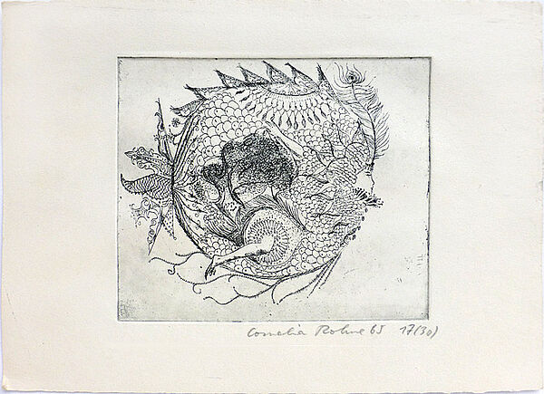 Radierung auf dickem Papier, rechts unterhalb der Darstellung mit Bleistift handsigniert, datiert (19)"65" und bezeichnet "17/30". Rückseitig mit Bleistift handschriftliche Widmung der Künstlerin an Walter Danz, bedeutender hallischer Fotograf (1904 - 1986) sowie biografische Notizen von fremder Hand. Geringe Alters-, Griff- und Lagerspuren.