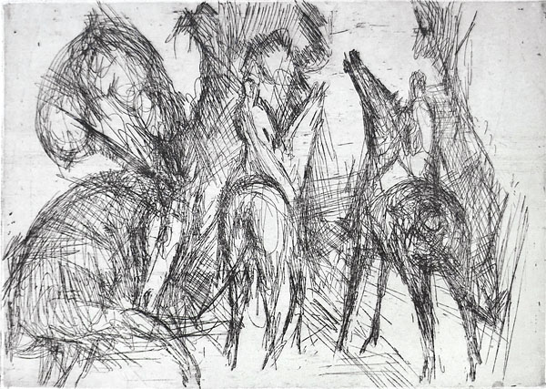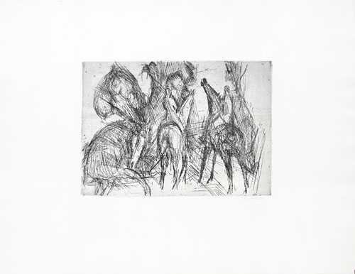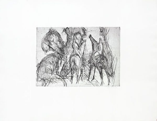 Radierung (Strichätzung) auf Weißenborn-Bütten, rechts unterhalb der Darstellung mit Bleistift handsigniert und datiert (19)"67" oder "68", Blattmaße ca. 58 x 41,5 cm, Bildmaße ca. 30 x 20,5 cm, geringe Alters-, Griff- und Lagerspuren. Insbesondere zeigt sich eine leichte Knickspur am oberen rechten Rand.