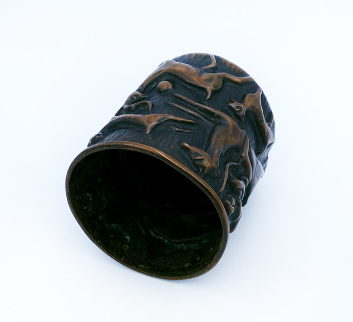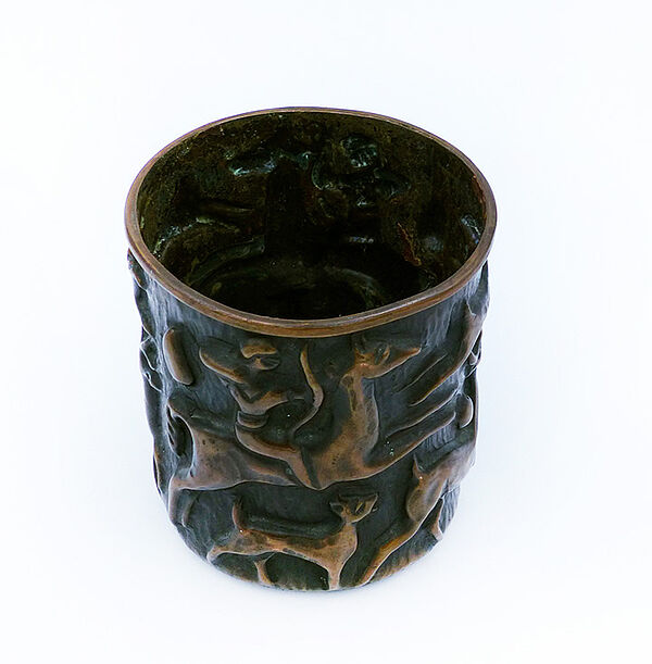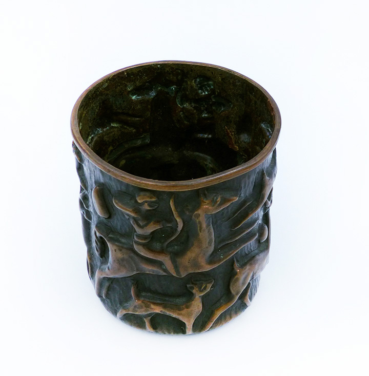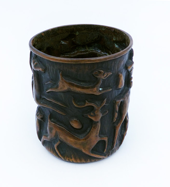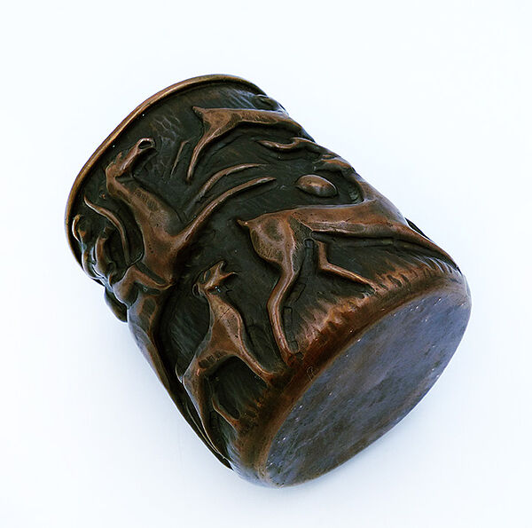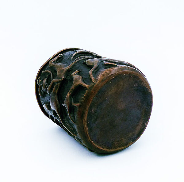 Zylindrischer Kupferkorpus, die Wandung zeigt zweimal das geprägte, akzentuiert reliefierte, stark stilisierte Motiv eines berittenen Jägers mit Hund, der mit dem Bogen einen Hirsch und und eine Hirschkuh jagt. Umbördelter Rand. Höhe ca. 10 cm,