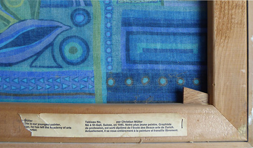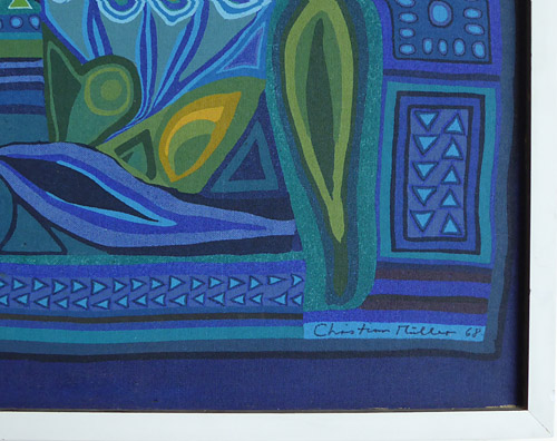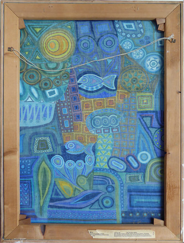 Mit stilisierten Meeresmotiven bedruckte Leinwand, rechts unten handsigniert, datiert (19)"68". Die Leinwand ist auf einen Keilrahmen aufgezogen, dieser wiederum mit einer einfachen, weiß gefassten (wohl originalen) Holzleiste gerahmt. Bildmaße ca. 54 x 74, Rahmenaußenmaße ca. 76,8 x 57 cm, leichte Alters-, Griff- und Lagerspuren.