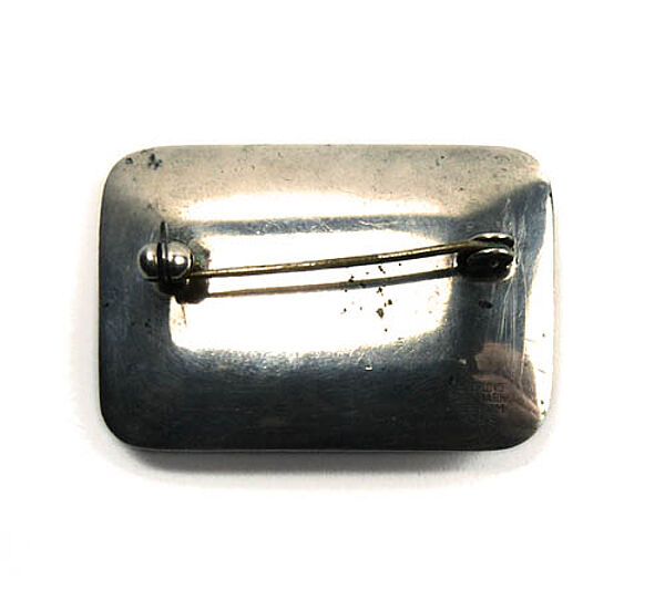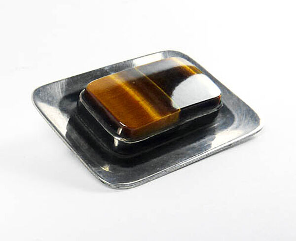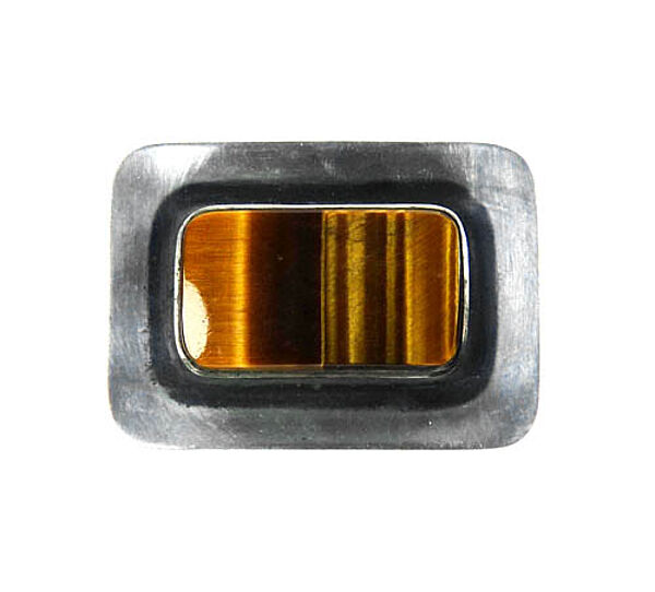 In der Grundform querrechteckiger, leicht gemuldeter Silberkorpus (925er), der mittig eine rechteckige Tigeraugenplatte in Zargenfassung trägt. Maße der Brosche ca. 4 x 2,8 cm, Maße des Tigerauges ca. 2,4 x 1,5 cm, ungeputzter Zustand mit ungleichmäßiger Patina und geringen Trage- bzw. alten Putzspuren. Rückseitig Markung und Sicherheitsbroschierung mit Kugelkopf, wohl 60er, Anfang der 70er Jahre.