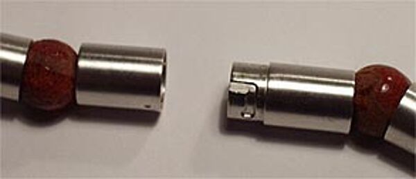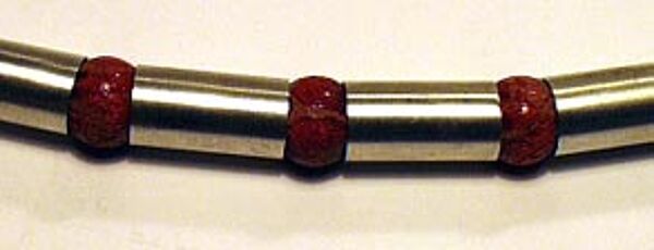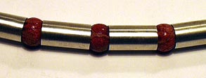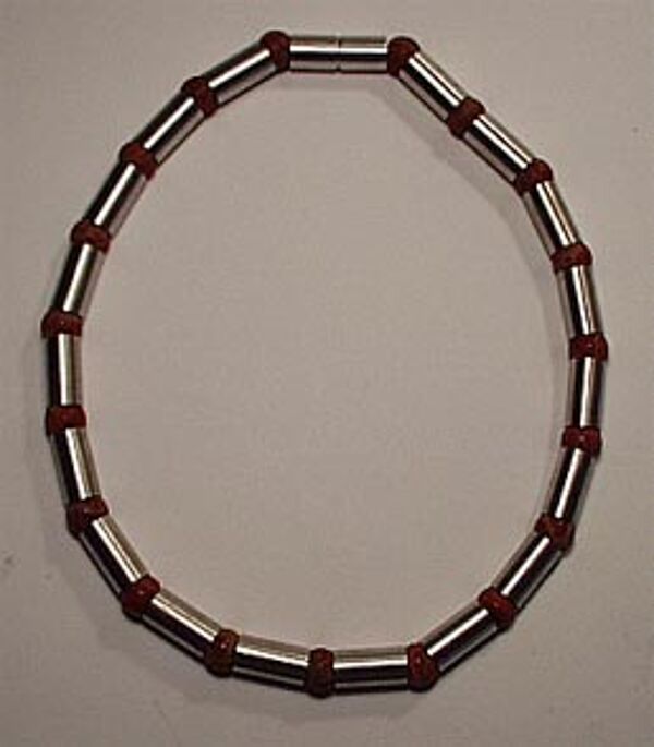 Kette aus röhrenförmigen Silbergliedern im Wechsel mit kugelförmigen Schaumkorallen. Kettenlänge ca. 45 cm, Durchmesser der Schaumkorallen knapp 1 cm, Steck-Schraub-Verschluss, siehe Foto. Wohl Deutschland Ende der 70er, Anfang der 80er Jahre.