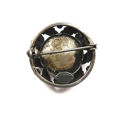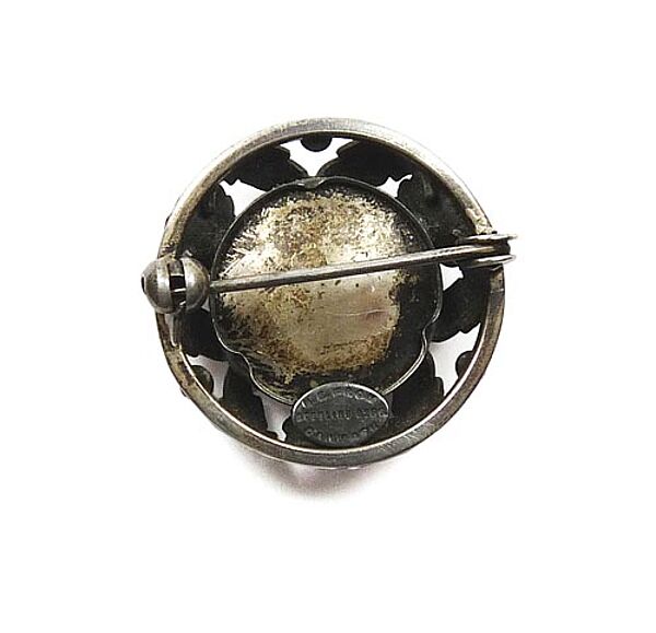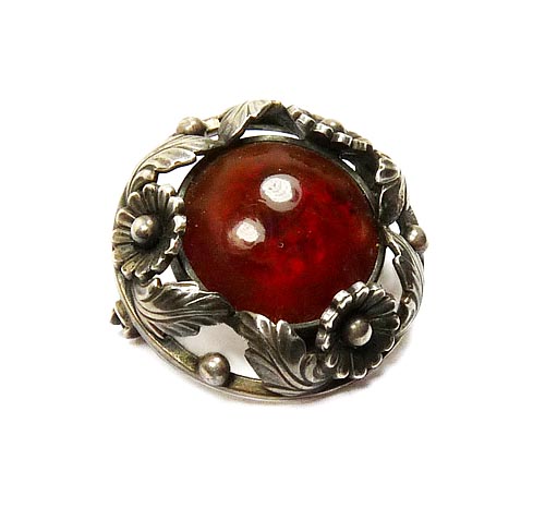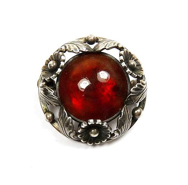 In der Grundform runder, offen gearbeiteter Silberkorpus ("Sterling", 925er), der zentral einen ebenfalls runden, recht hoch gewölbten, braunen, luziden Bernstein-Cabochon in Zargenfassung trägt. Umlaufend plastisch ausgearbeitete Blatt- und Blütenelemente. Durchmesser ca. 2,4 cm, ungeputzter Zustand mit leichter Patina und geringen Tragespuren. Wohl 1960er, 70er Jahre.