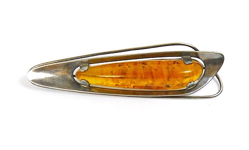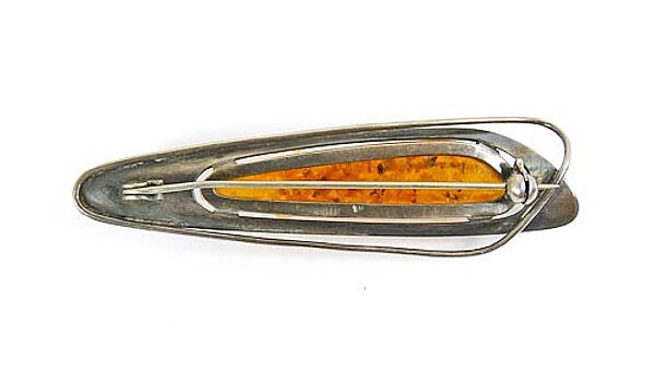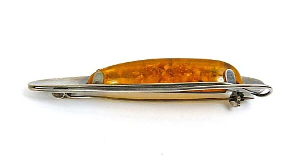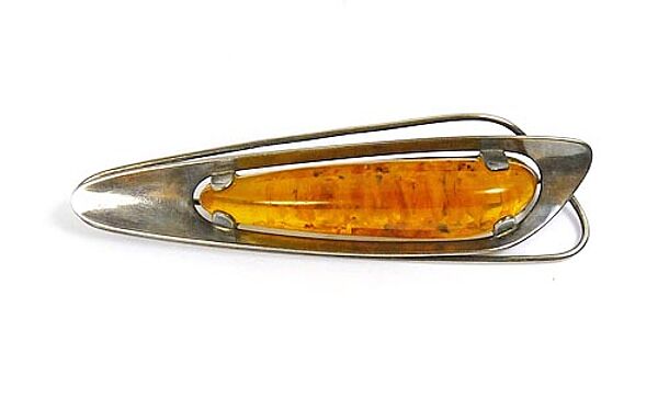 Dreieckig-organisch konfigurierter Silberkorpus (835er), der außenseitig von einem die Form wiederholenden, aber in der Längsachse gespiegelten Silbersteg umgeben ist. Zentral befindet sich ein luzider, orange-bräunlicher, der Form angepasster Polybern-Cabochon in Krappenfassung. Länge ca. 6,5 cm, ungeputzter Zustand mit moderater Patina und geringen Tragespuren. Rückseitig Markung, Bezeichnung "pb" für Polybern (ein vom Ostseeschmuck entwickelter Stein, der aus Bernsteingranulat gewonnen wurde) und Sicherheitsbroschierung mit Kugelkopf. Wohl 60er Jahre.