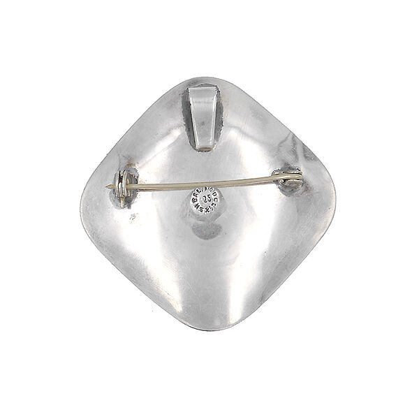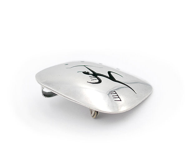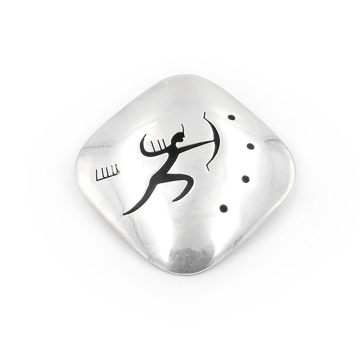 Handgefertigter, hohl gebödeter, annähernd quadratischer Silberkorpus (925er) mit abgerundeten Ecken, der vorderseitig eine filigran ausgeschnittene, stilisierte Szenerie aufweist: im Mittelpunkt derselben ist eine gleichermaßen elegante wie archaische unbekleidete Figur im Sprung zu sehen, die in einer Hand einen Bogen vor sich hält und vermutlich einen aztekischen Krieger oder Jäger darstellt. Maße ca. 4,2 x 4,2 cm, diagonal knapp 5 cm. Geputzter, sehr guter Zustand. Rückseitig bezeichnet "MEXICO" und schwer erkennbare weitere Bezeichnung, (vermutlich verschlagene?) Markung, wohl 1960er bis 80er Jahre.