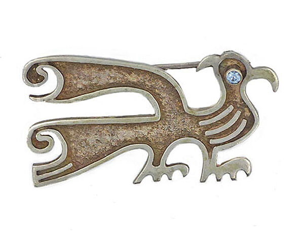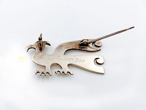 Silberner Korpus (900er) in Form eines nach rechts gewandten, stilisierten Vogels, die Kanten sind flach erhaben reliefiert, das Auge wird durch einen hellblauen, faszetiert geschliffenen Schmuckstein in Zargenfassung gebildet. Die inneren Flächen sind leicht dunkel patiniert. Maße ca. 4 cm x 2,5 cm, ungeputzter Zustand mit diskreter Patina und leichten Trage- und Altersspuren. Rückseitig Sicherheitsbroschierung sowie Bezeichnung "Ecuador". Wohl 1960er Jahre.