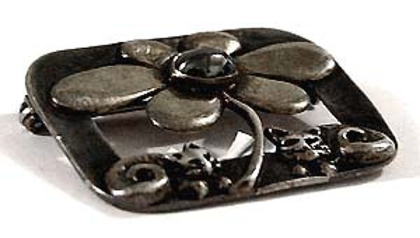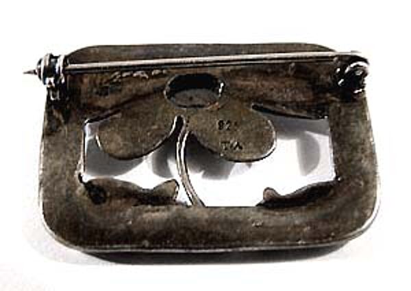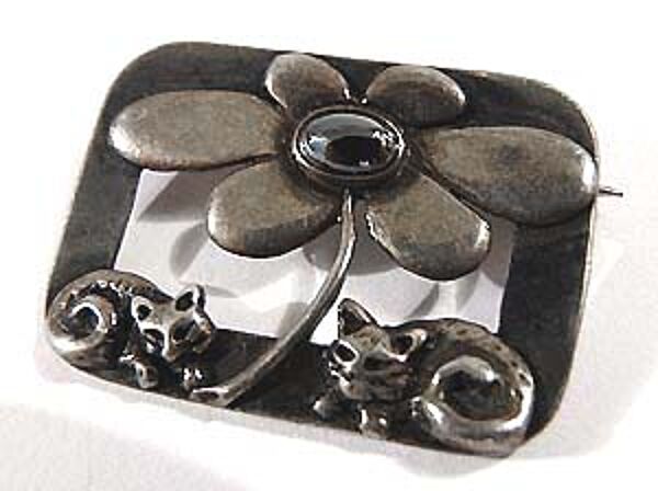In der Grundform rechteckiger, offen gearbeiteter Silberkorpus (825er) mit abgerunseten Ecken. Halbplastisch ausgearbeitetes Motiv einer Blume, in deren Blüte ein Hämatit in Zargenfassung integriert ist, die von zwei deutlich kleineren, ruhenden Katzen flankiert wird. Maße ca. 3 x 2,2 cm, ungeputzter Zustand mit relativ deutlicher Patina und geringen Tragespuren. Rückseitig Sicherheitsbroschierung mit Kugelkopf und ungedeutete Markung (TA?). Wohl 70er Jahre.
