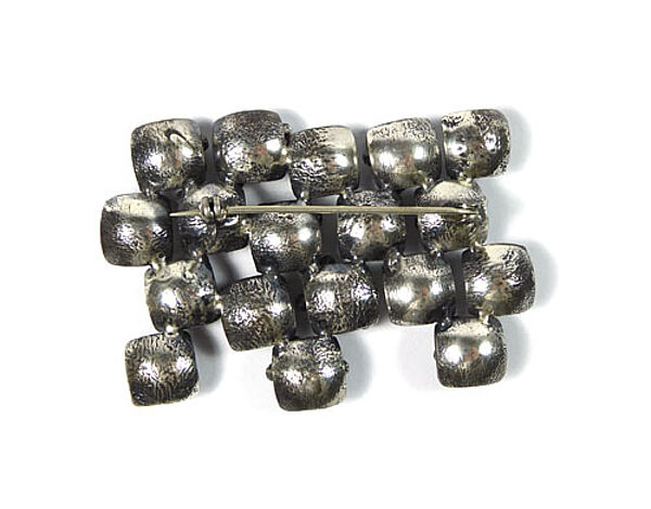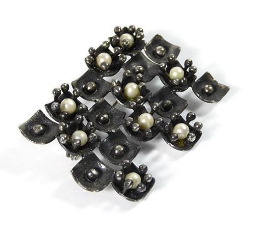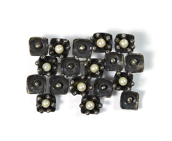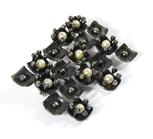 Silberner Korpus (925er), der sich aus vielen kleinen schalenförmigen Quadraten zusammensetzt, die mittig entweder eine kleine Ailberkugel oder eine kleine Zuchtperle tragen. Maße ca. 5,5 x 4 cm, ungeputzter Zustand mit dunkler Patina und geringen Tragespuren. Rückseitig Sicherheitsbroschierung mit Kugelkopf. Ungemarkt, wohl Deutschland der 1960er, 70er Jahre.