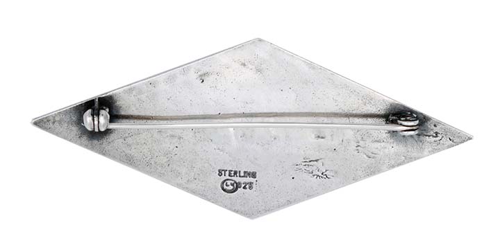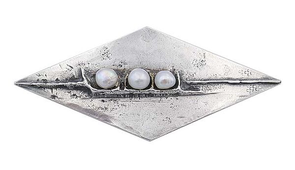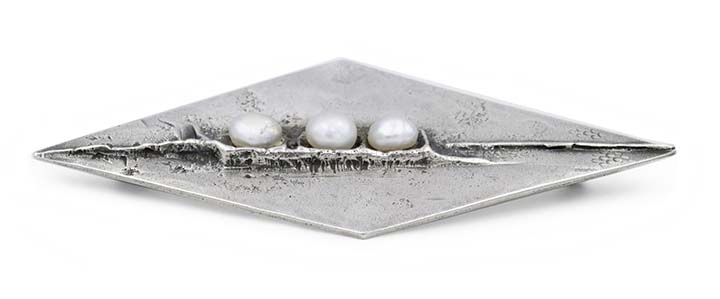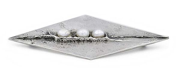 Rhombusartig geformter, fast planer Silberkorpus (925er), der mittig eine Reihe von drei Zuchtperlen trägt, diese sind eingebunden in eine quer verlaufende, gratartige Erhebung der Broschenoberfläche. Maße ca. 7 x 3,2 cm, ungeputzter Zustand mit diskreter Patina und leichten Tragespuren. Rückseitig Sicherheitsverschluss mit Kugelkopf sowie Markung. Wohl 1970er Jahre (Markung ab Anfang der 1970er Jahre).
