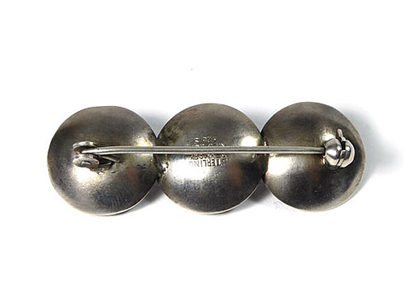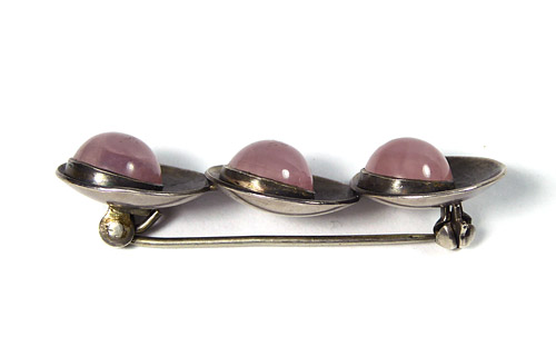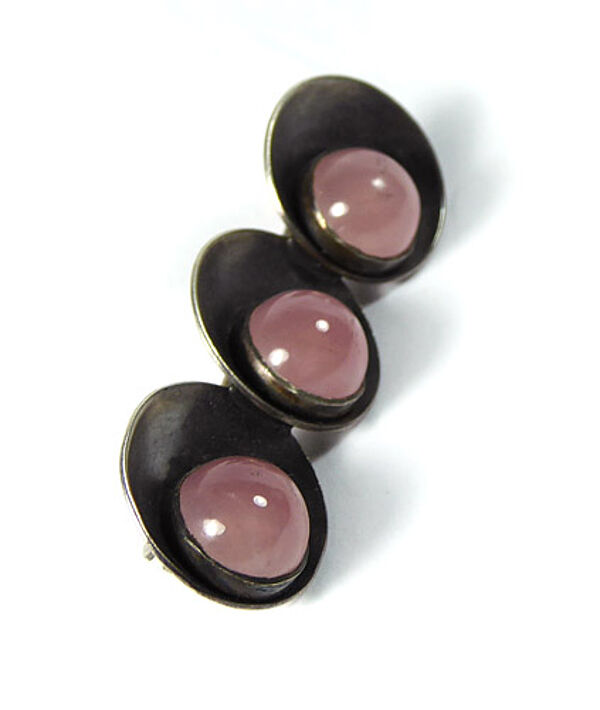 Silberkorpus (925er) aus drei nebeneinander liegenden, schalenförmigen Elementen, die jeweils zentral einen blass-violetten Cabochon in Zargenfassung (wohl Rosenquarz) tragen, wobei die Ausrichtung der Steine leicht achsenverschoben ist. Länge: ca. 4,5 cm, ungeputzter Zustand mit dunkler Patina und geringen Tragespuren. Rückseitig Sicherheitsbroschierung mit Kugelkopf und Markung, vermutl. 1960er Jahre.