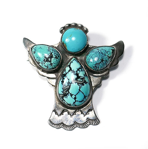 Handgefertigter Korpus aus Sterling-Silber in Form eines stilisierten Vogels, der vorderseitig drei unterschiedliche große tropfenförmige und einen runden Türkis-Cabochon, jeweils in Zargenfassung, trägt. Im Schwanzbereich des Vogels sind zwei Reihen von wellenartigen Punzierungen erkennbar. Maße ca. 3,5 x 3,5 cm, ungeputzter Zustand mit leichter Patina und geringen Tragespuren. Rückseitig Markung und Sicherheitsverschluss mit Kugelkopf. Wohl 1960er, 70er Jahre.