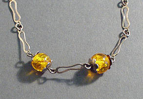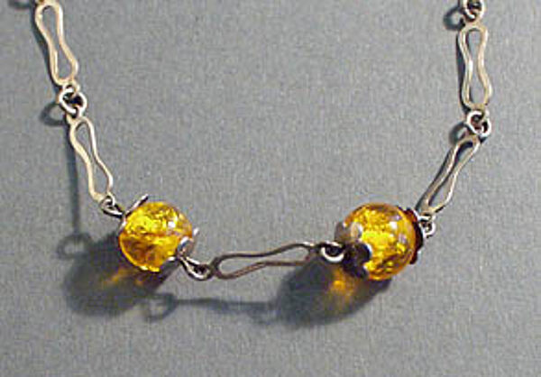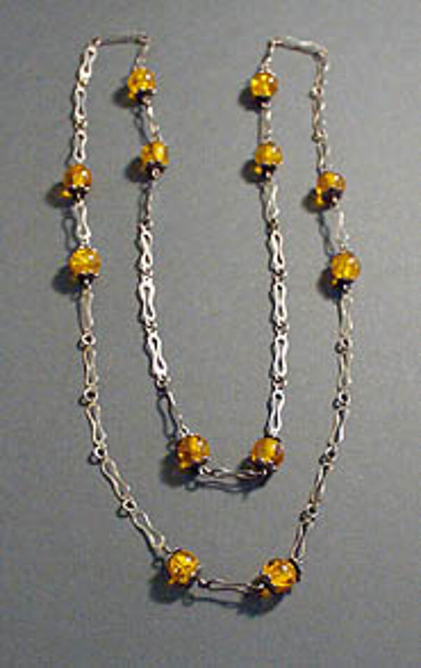 Die Kette besetht aus Abschnitten mit länglichen, in der Form an eine Acht erinnernden Silbergliedern (835er), die sich mit luziden Bernsteinkugeln abwechseln, Länge ca. 45 cm, ungeputzter Zustand mit geringen Tragespuren. Gemarkt, wohl 60er Jahre.
