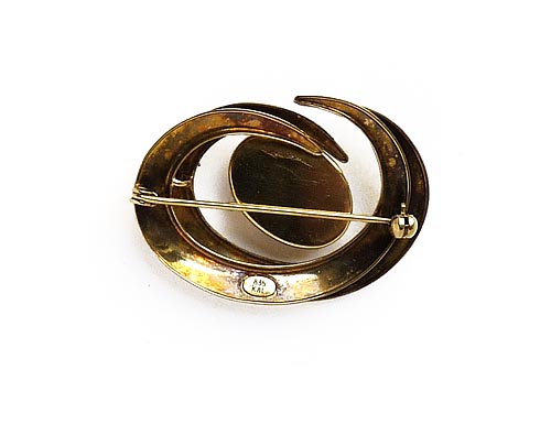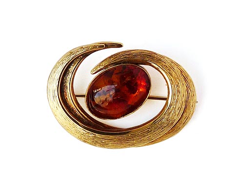 Schweifartiger, silberner (835er), vergoldeter Korpus. der einen zentralen, bräunlichen, luziden Bernstein-Cabochon in Zargenfassung trägt. Breite ca. 4 cm, ungeputzter Zustand mit geringen Tragespuren. Rückseitig Markung sowie Sicherheitsbroschierung mit Kugelkopf. Wohl 60er, 70er Jahre.