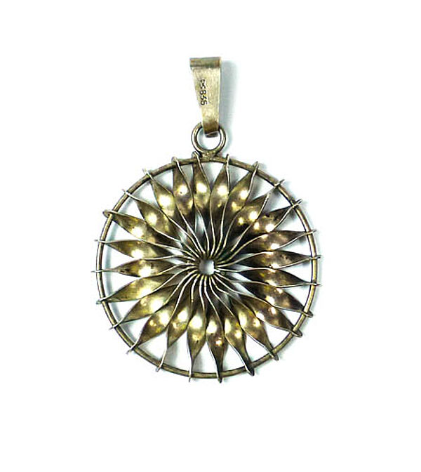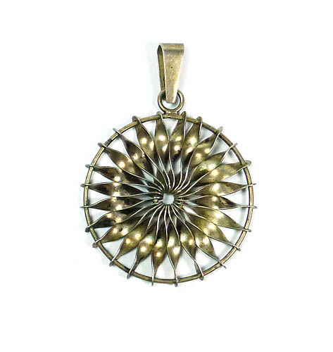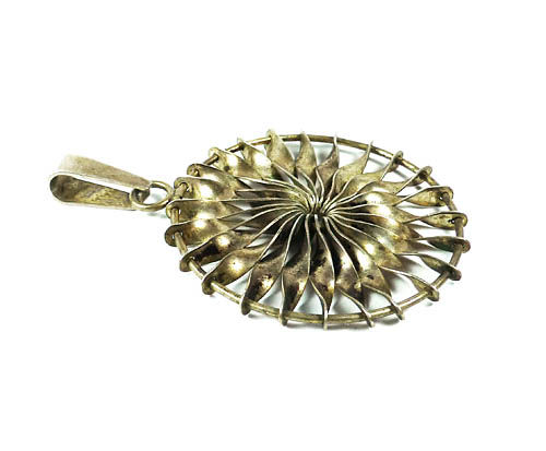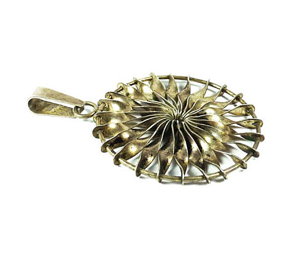 Offen handgearbeiteter Silberkorpus (835er), wobei ein schmaler drahtartiger Steg eine stilisierte Blüte (oder Sonne) aus dicht gelagerten, leicht verdrillten Elementen umschließt. Oberseitig bewegliche, einfache, sich nach unten verjüngende Öse. Hier auch gemarkt. Durchmesser ca. 3,5 cm, Länge mit Öse ca. 5 cm, ungeputzter Zustand mit leichter Patina und geringen tragespuren. Wohl der 1960er Jahre.