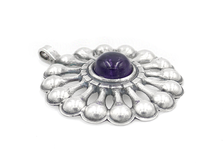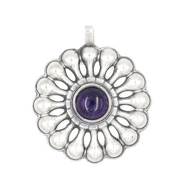Silberner Korpus (925er) in Form einer stark stilisierten Blüte, oberseitig einfache, bewegliche Anhänger-Öse, mittig befindet sich ein runder, zargengefasster Amethyst-Cabochon mit einem Durchmesser von ca. 0,8 cm, der Broschen-Durchmesser beträgt ca. 3 cm, Länge mit Öse ca. 3,5 cm, geputzter Zustemd mit geringen Trage- und Altersspuren. Wohl 1960er Jahre.
