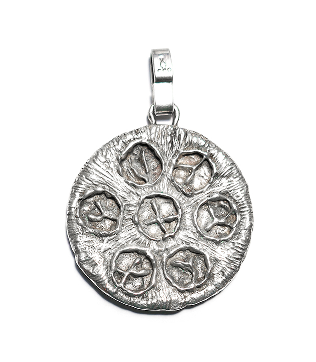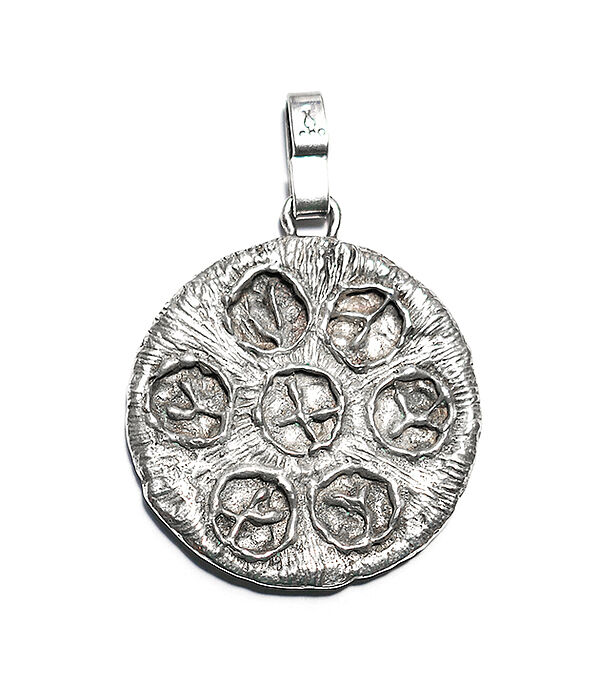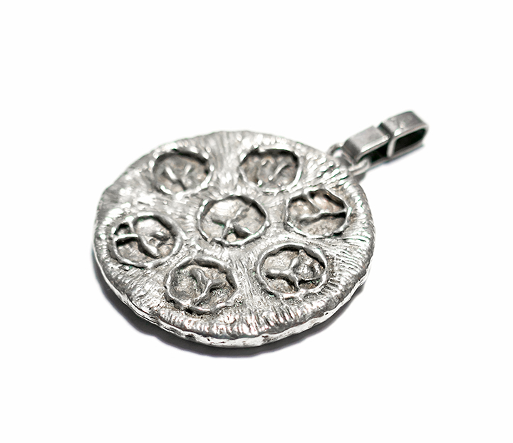 Scheibenförmiger Silberkorpus (835er), oberseitig kleine, starre Öse, hier ist eine bewegliche, längliche Öse angesetzt. Die eine Seite zeigt dicht beieinander liegende stilisierte Blüten, auf der anderen Seite dicht beieinander liegende Ringelemente, die mittig abstrahierte Buchstaben aufweisen. Durchmesser ca. 3 cm, Länge mit Öse ca. 4 cm. Ungeputzter Zustand mit leichter Patina und geringen Tragespuren. Markung an der Öse, wohl 1960er, 70er Jahre.