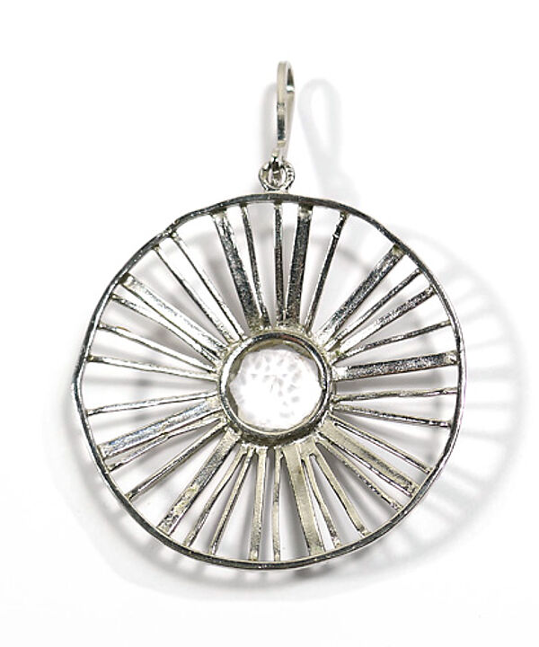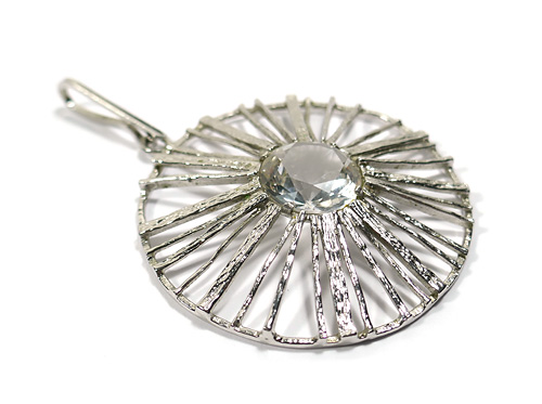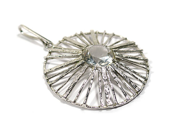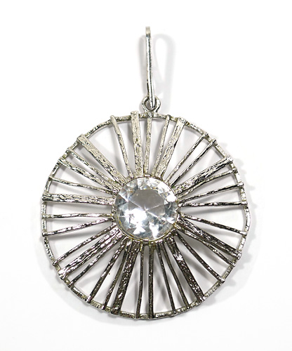 Silberner Korpus (835er) in Form eines Rades, dessen Vorderseite unregelmäßig strukturiert ist. Mittig ist sich ein facettierter Bergkristall in Zargenfassung integriert. Oberseitig längliche, schlanke, bewegliche Öse. Durchmesser ca. 5 cm, Steindurchmesser ca. 1,5 cm, Länge mit Öse ca. 7,5 cm, geringe Alters- und Tragespuren. Wohl 1960er Jahre.