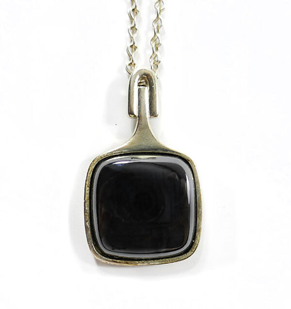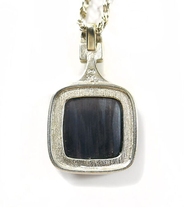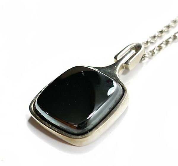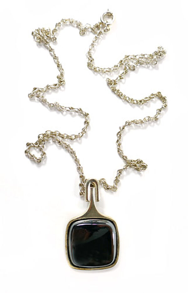 Silberner Korpus (935er) mit wohl original zugehöriger feingliedriger Kette mit Ringösenverschluss. Der Hauptteil des Anhängers ist quadratisch und wird durch eine ebenfalls quadratische, polierte Hämatitplatte mit leicht abgerundeten Ecken in Zargenfassung dominiert. Nach oben setzt sich der Korpus in ein stilartiges Element fort, welches in einer starren Öse endet, die sich haubenartig über das Stilende wölbt. Länge Anhänger ca. 3,8 cm, Hämatit ca. 2 x 2 cm, Länge Kette ca. 47 cm. Ungeputzter Zustand mit diskreter Patina und leichten Tragespuren. Perli (Schwäbisch Gmünd) der 1960er, 70er Jahre.