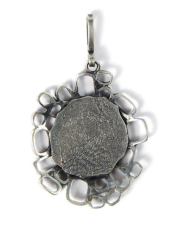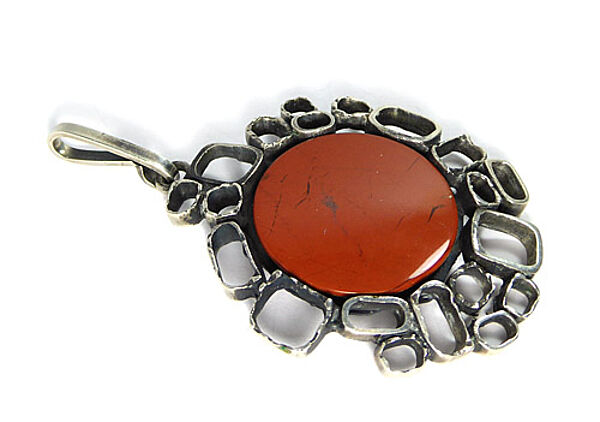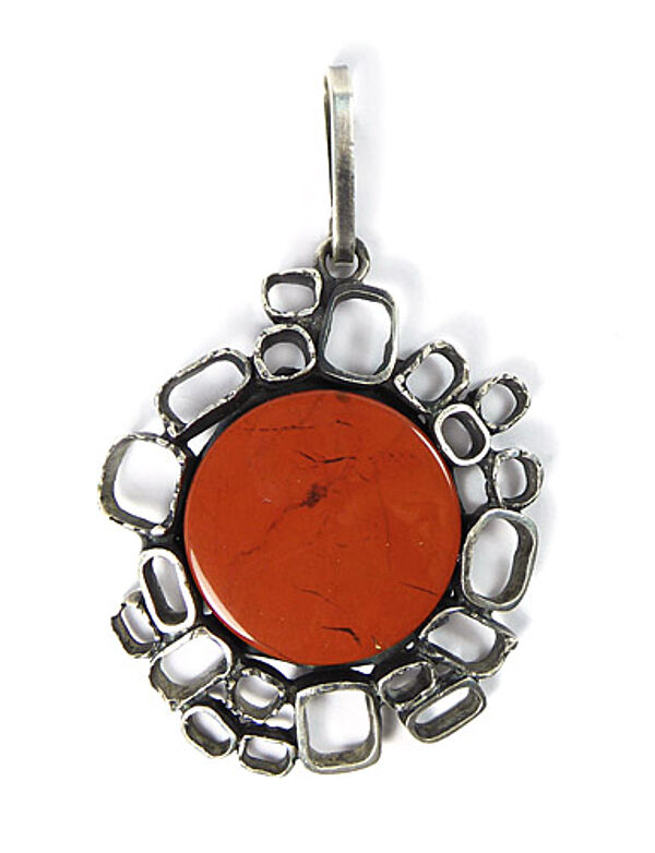 Silberkorpus (835er) der durch eine mittig angeordnete, rotbraune Schmucksteinscheibe (wohl Jaspis) dominiert wird. Umlaufend befindet sich eine wabenartige Umrandung. Oberseitig längliche, bewegliche Öse. Maße ca. 5 x 4 cm, Länge mit Öse ca. 6,6 cm, Durchmesser der Jaspisscheibe ca. 2,5 cm, ungeputzter Zustand mit leichter Patina und geringen Tragespuren. Ungemarkt, wohl Deutschland der 1960er, 70er Jahre.