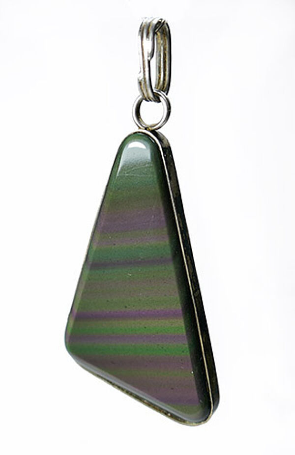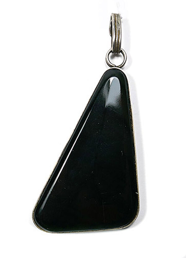 In rückseitig offener Silberzarge (geprüft) gefasster, in der Grundform dreieckiger Regenbogen-Obsidian mit abgerundeten Ecken, eine Seite plan, eine Seite flach-dreieckig facettiert geschliffen. Oberseitig bewegliche, recht dominante Öse. Längste Seite des Dreiecks ca. 6 cm, Länge mit Öse ca. 7,5 cm, ungeputzter Zustand mit teilweise dunkler Patina des Silbers, geringe Tragespuren. Ungemarkt, wohl 1950er, 60er Jahre.
