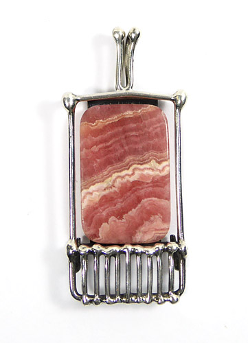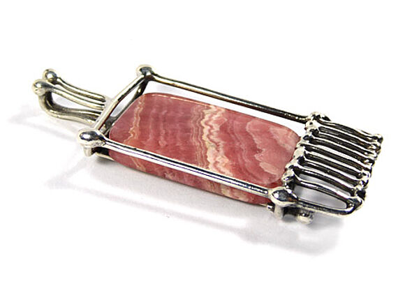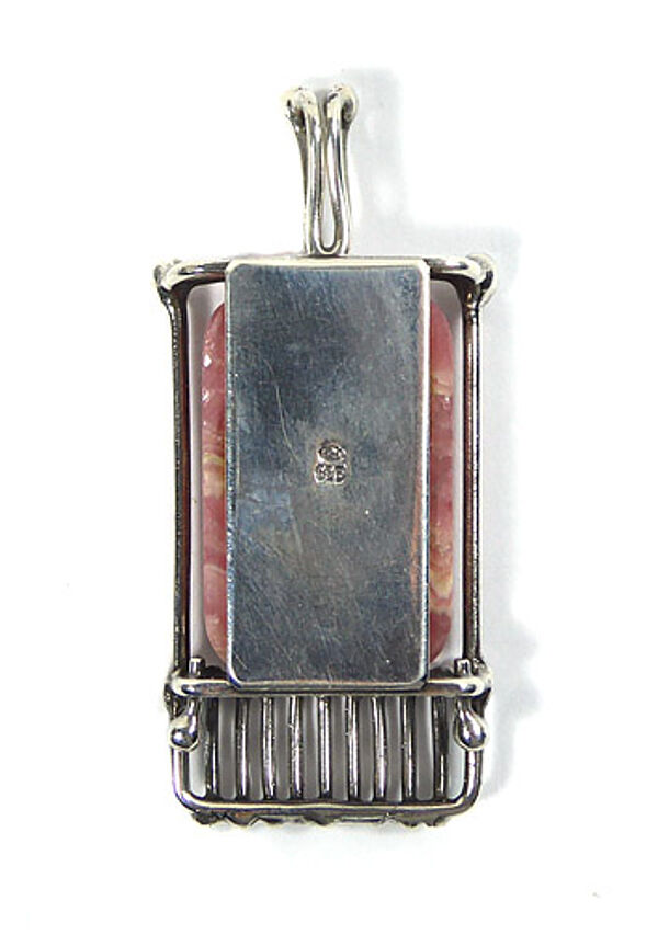 Silberner Korpus (925er): eine bizarre Rahmenkonstruktion hält eine hochrechteckige Rhodochrosit-Platte mit abgerundeten Ecken, im unteren Drittel gitterförmiges Element, oberseitig starre Öse aus gebogenen Silberdraht. Maße ca. 6 x 2,7 cm, Rhodochrosit ca. 3 x 2 cm, ungeputzter Zustand mit leichter Patina und geringen Tragespuren. Rückseitig gemarkt ("R", nicht aufgelöst), wohl Deutschland der 1970er Jahre