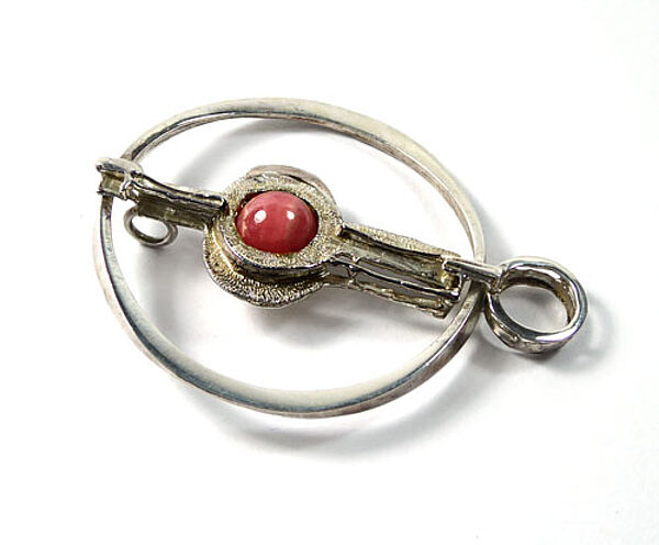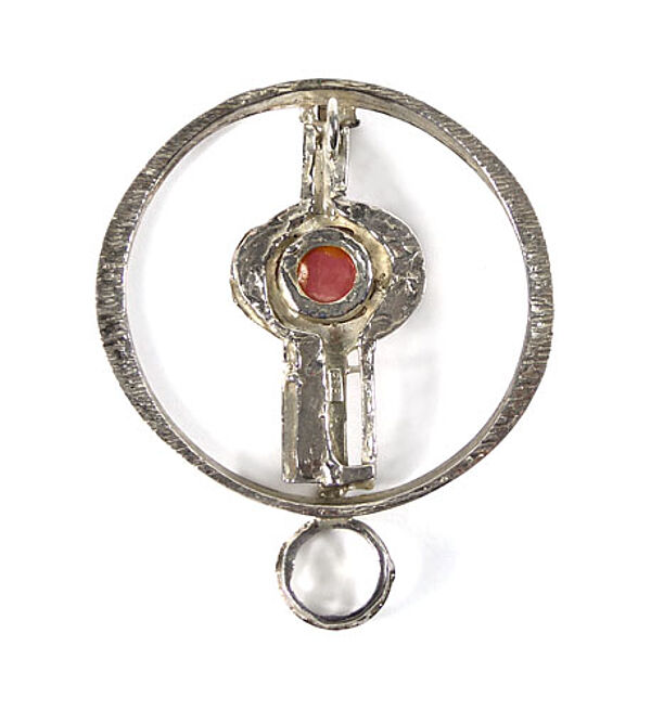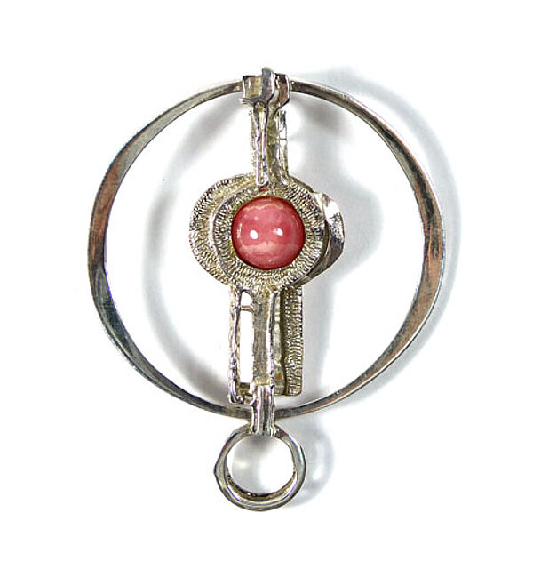Ringförmiger Silberkorpus (835er), mittig bizarres stelenartiges Element, welches zentral eine Rhodochrosit-Perle integriert hat. Unterseitig kleines Ringelement. Rückseitig starre Öse. Maße ca. 6,5 x 5 cm, ungeputzter Zustand mit minimalen Tragespuren. Ungemarkt, wohl Deutschland der 1970er Jahre.