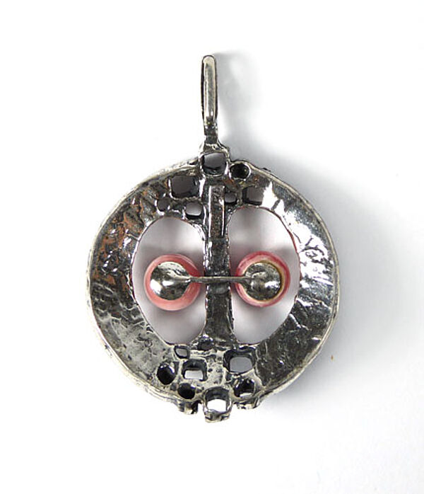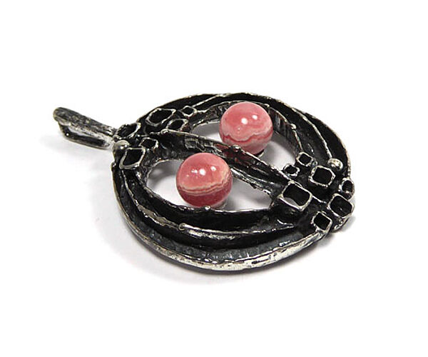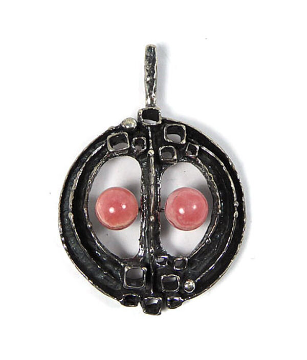 Annähernd runder, zentral offen gearbeiteter Silberkorpus (925er), der ober- und unterseitig quadratische, mit einer Zarge akzentuierte Perforierungen aufweist sowie mittig zwei Rhodochrosit-Perlen integriert hat. Oberseitig starre Öse. Durchmesser ca. 3,6 cm, Länge mit Öse ca. 5 cm, ungeputzter Zustand mit dunkler Patina und minimalen Tragespuren. Rückseitig Markung, wohl 1960er, 70er Jahre.