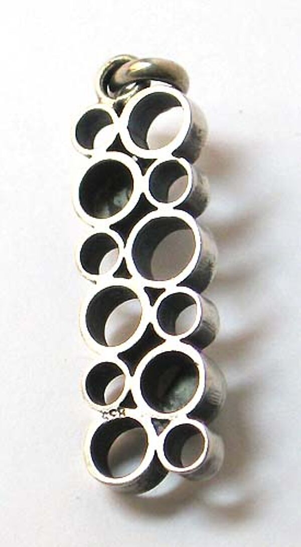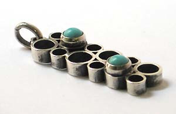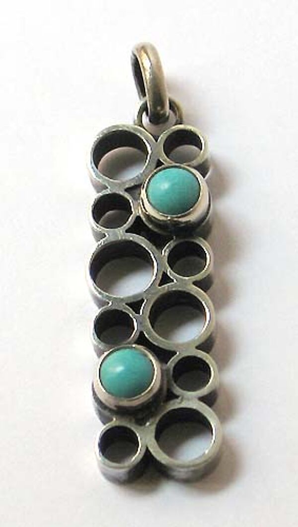 Der silberne Korpus (835er Silber) setzt sich aus zwei Reihen unterschiedlich großer Ringe zusammen, wovon zwei einen Türkis-Cabochon in Zargenfassung umschließen. Länge mit Öse ca. 4,3 cm, Breite ca. 1,2 cm, ungeputzter Zustand mit leichter Patina und geringen Gebrauchsspuren. Ungemarkt, wohl Deutschland oder Skandinavien der 60er Jahre.