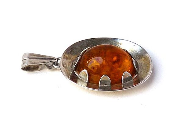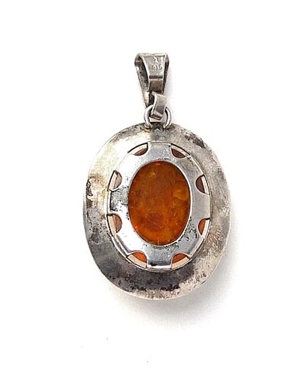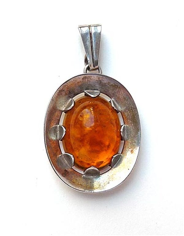 Hochovaler, leicht konkaver, rückseitig offen gearbeiteter Silberkorpus (835er), der zentral einen luziden, orange-bräunlichen, ebenfalls ovalären Bernstein-Cabochon (oder evtl. doch Polybern, wenngleich diesbzgl. nicht gestempelt) in Krappenfassung trägt. Oberseitig annähernd dreieckig konfigurierte, relativ lange, bewegliche Öse. Länge mit dieser ca. 4,5 cm, ohne Öse, 3,1 cm. Ungeputzter Zustand mit leichter Patina und geringen Tragespuren. Wohl 60er Jahre.