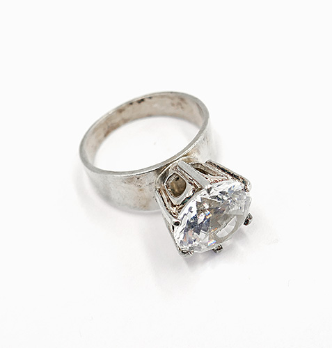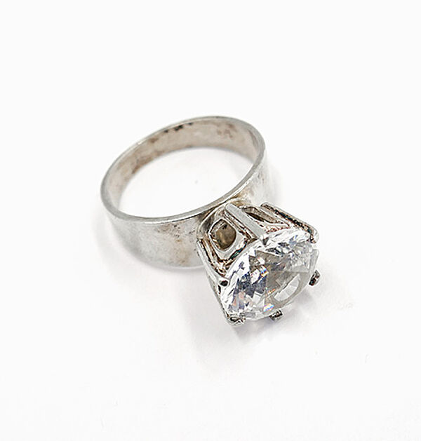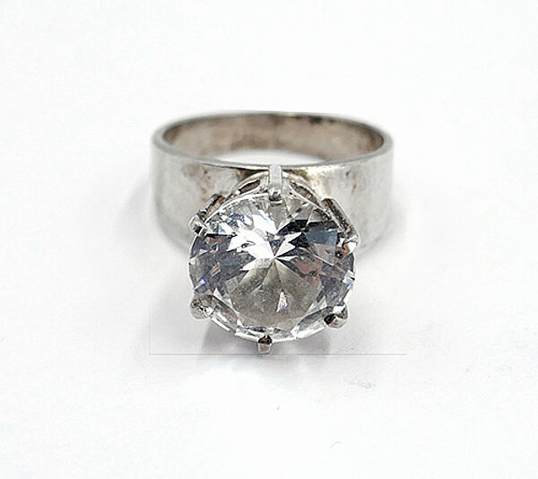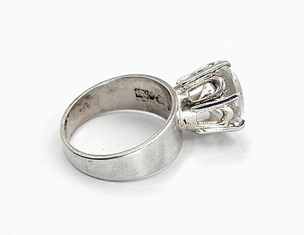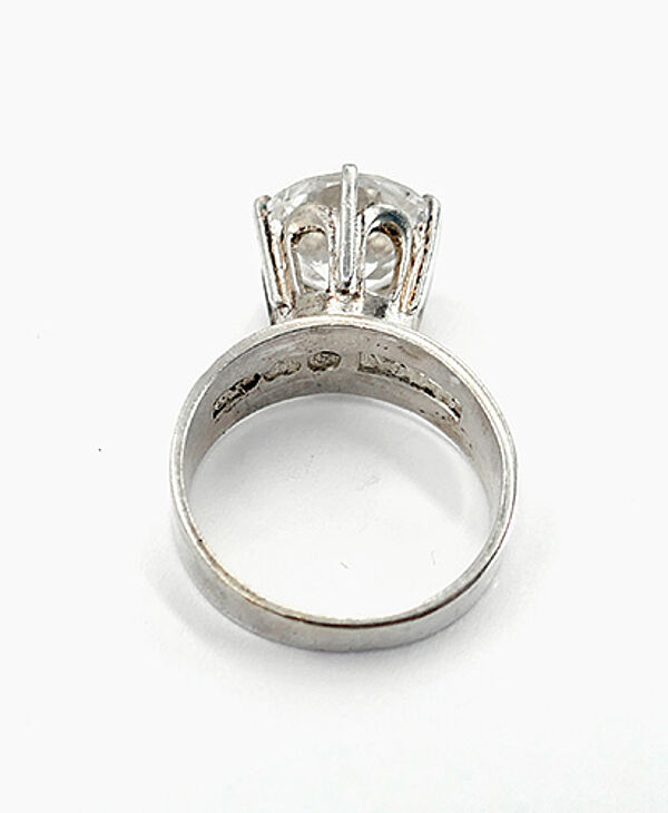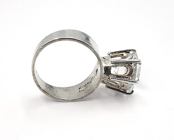 Silberner Ring (830er) mit schlichter, relativ breiter, sich zum Ringkopf leicht verbreiternder Schiene, dominanter, kronenartiger Ringkopf, der einen rund facettierten Bergkristall in Krappenfassung trägt. Ringinnendurchmesser ca. 17 mm, Ringgröße 53, Stein-Durchmesser ca. 1,1 cm, ungeputzter Zustand mit leichter Patina und geringen Tragespuren. Innenseitig gemarkt sowie bezeichnet "F" (= Falköping) und "R9" (= 1967).