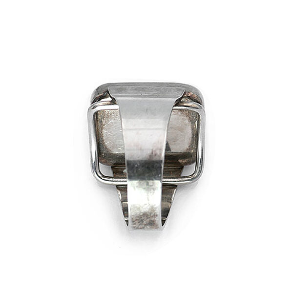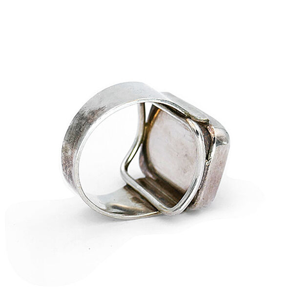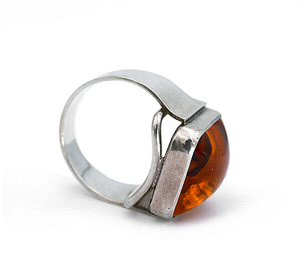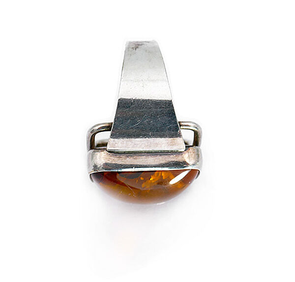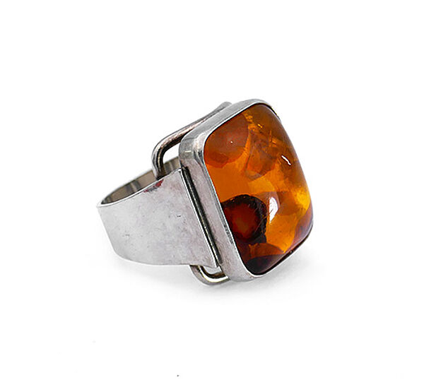 Der silberne Korpus (835er) weist eine sich zum Kopf hin jeweils verbreiternde Ringschiene auf. Der rechteckige Ringkopf mit abgerundeten Ecken ist mit einem die Fingerform aufnehmenden, konkav gewölbten Steg unterlegt und besteht selbst aus einem zargengefassten, orange-braunen, luziden, typisch "bunten" Polybern-Bernstein. Maße des Bernsteins ca. 2 x 1,5 cm, Ringdurchmesser ca. 19 mm (entspricht Ringgröße 59,5), geringe Tragespuren. Innen gemarkt und bezeichnet "pb" für Polybern), wohl 1960er Jahre.