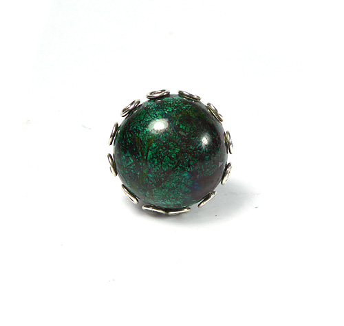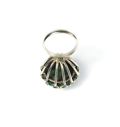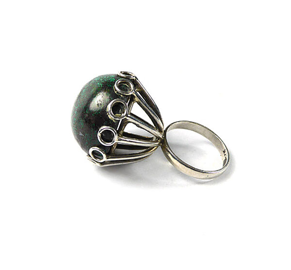 Silbener Korpus (925er) mit einfachem Reif und aufwenigem, korbartigen Ringkopf, der einen Malachit-Cabochon in modifizierter (ringförmiger) Krappenfassung trägt. Ringinnendurchmesser ca. 17 mm, Cabochondurchmesser ca. 25 mm, geringe Tragespuren. Wohl Skandinavien der 1960er, 70er Jahre.