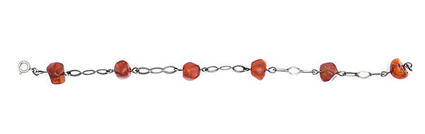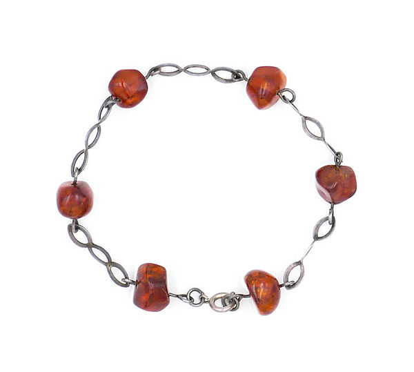 Silbernes Armband (835er Silber), wobei sich jeweils drei zueinander starre, ovaläre Kettenglieder mit insgesamt sechs gemugelten, wohl annähernd in der natürlichen Form belassenen, orange-braunen, luziden, gestifteten Bernsteinen abwechseln. Ringösenverschluss. Länge ca. 21,5cm, ungeputzter Zustand mit geringen Tragespuren. Gemarkt, wohl 60er Jahre.
