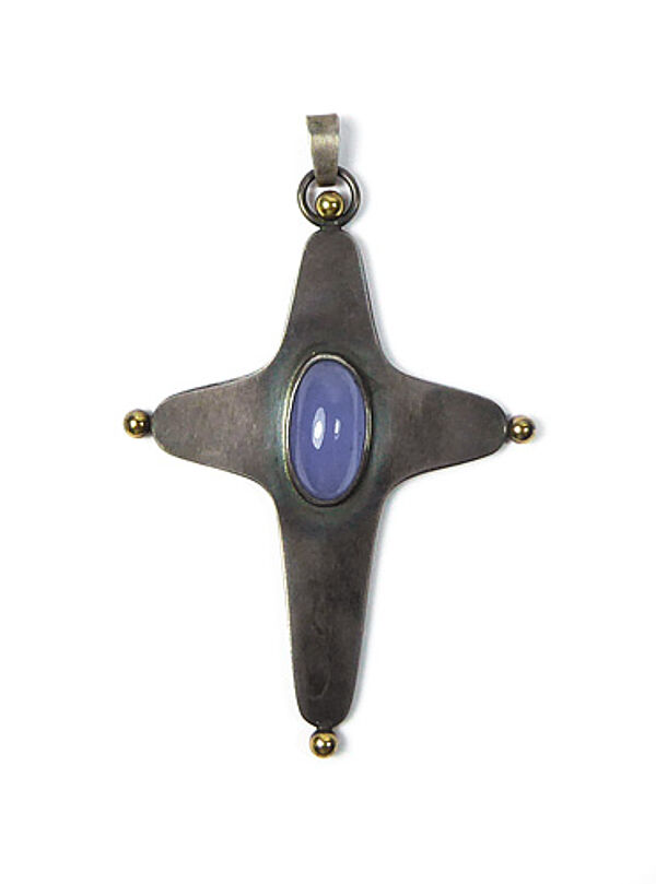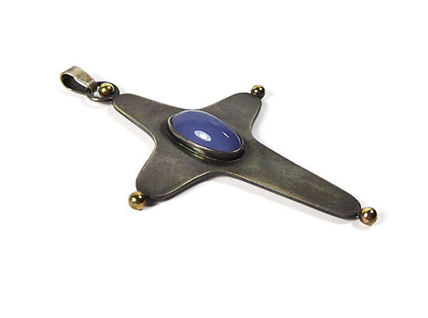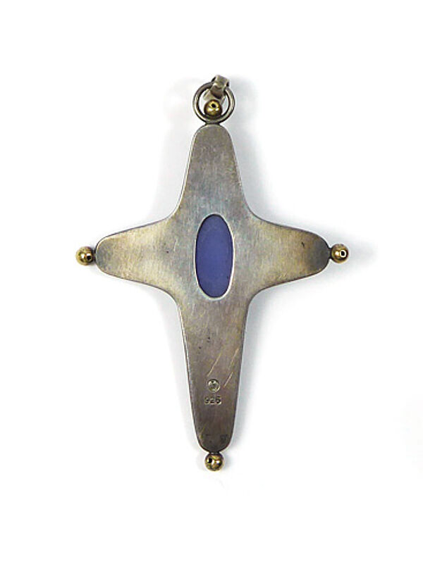 Silberner Korpus (925er) in Kreuzform, wobei die Länks- und Querbalken organisch konvex geformt und mit kleinen Goldkugeln bekröbt sind. Mittig befindet sich ein hochovaler, milchig-hellblauer Schmuckstein-Cabochon (wohl Chalcedon) in Zargenfassung. Oberseitig bewegliche Öse. Länge mit Anhängeöse ca. 6,5 cm, ungeputzter Zustand mit fast gleichmäßiger, dunkler Patina und geringen Tragespuren. Rückseitig gemarkt (ungedeutet), wohl 1960er Jahre.