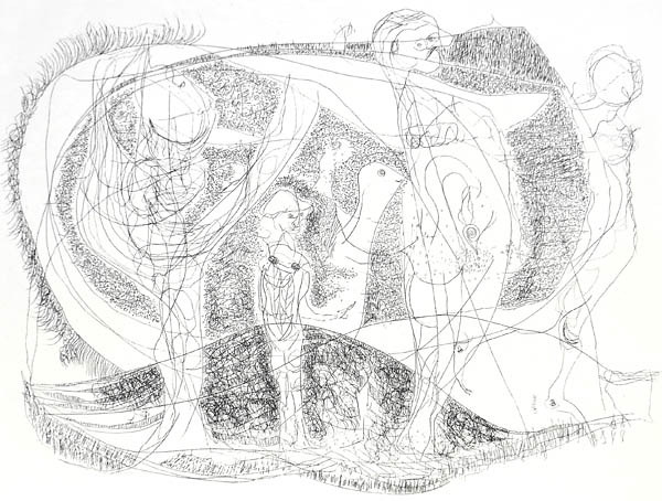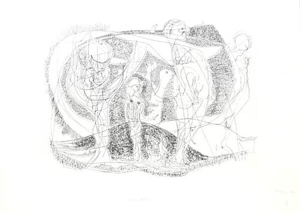 Steinritzung auf Bütten, bezeichnet, handsigniert und datiert "1971", Auflage 19/40, Prägestempel mit ALTENBOURG. Blattmaße ca. 40,5 x 29,7 cm.