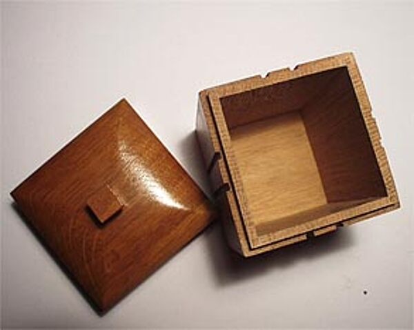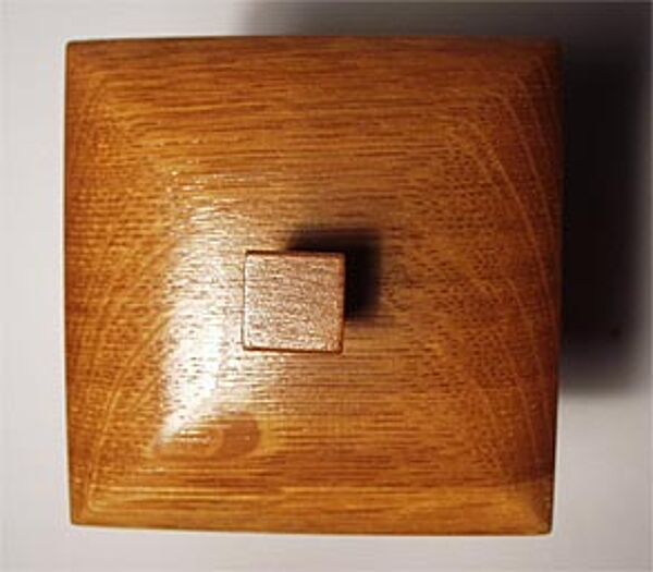 Holz-Dose, quadratischer Grundriss mit Deckel ("Tee-Turm"), lasiert, schöne Maserung, an der Außenfläche paralelle Fräsungen, Deckel mit Griff, H.: 16,5 cm B/T.: 7,5 cm, sehr guter Zustand, wohl 60er Jahre.