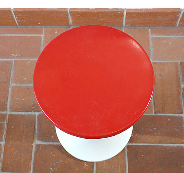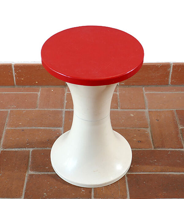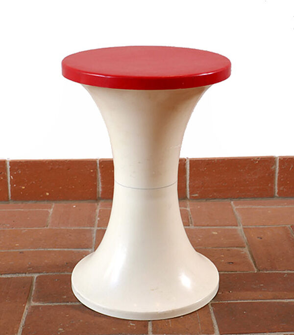Weißer, hohler, in der Draufsicht runder, über die gesamte Höhe deutlich taillierter Kunststoffkorpus, roter scheibenförmiger, abnehmbarer Deckel. Höhe ca. 45,5 cm, oberer Durchmesser ca. 30,5 cm, unterer Durchmesser ca. 30 cm, moderate Alters-, so z.T. einige Fleckspuren. 1970er Jahre.